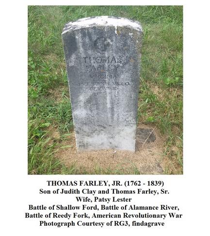 ~ 1780 or 1781, he again entered service as a volunteer under Colonel William Preston and Captain Henry Patton. He was marched from Montgomery County, where he lived, to North Carolina, near Guilford Court House and was in the Battle of Alamance River and the Battle of Reedy Creek Fork of Haw River at Whitesill’s Mills. General Green was commanding, at that time, part of the army. Farley was in service, and the tour was three months.